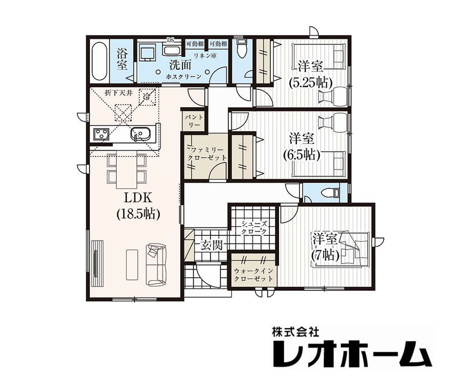 地震に強い耐震等級3などの性能評価書取得の平屋建ての建物は、全居室明るく収納付き、オシャレなキッチンの折り下げ天井、玄関のシューズクローク、ファミリークロークなど、とても便利です。