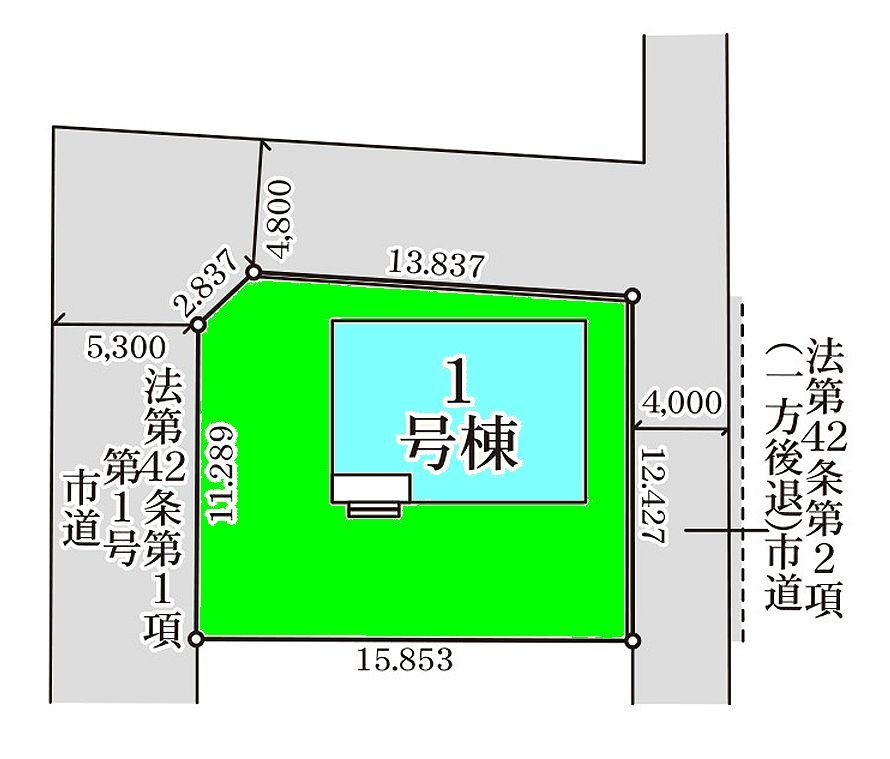 | 権利種類 | 所有権 | 接道 | 西側5.3M公道に接道 東側4M公道に接道 北側4.8M公道に接道 |